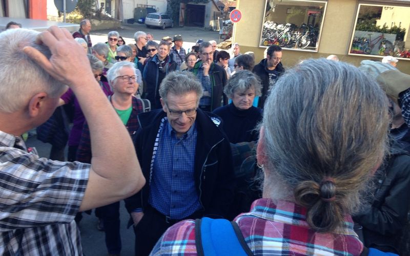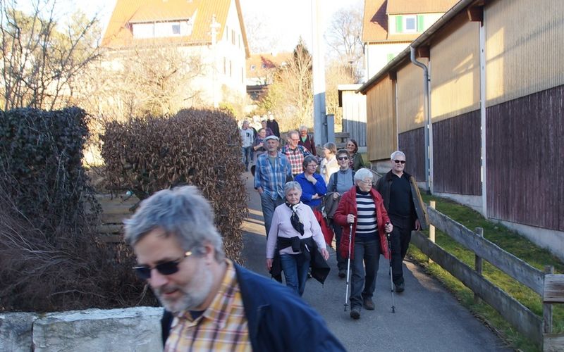 Nachdem diese erste Hürde genommen war, setzte sich die buntgemischte Karawane mit 55 Wanderern in Bewegung. Auf den insgesamt acht Kilometern, die wir dabei zurücklegten, wurde an verschiedenen Stellen immer wieder gestoppt, um Wissenswertes und Historisches über unseren Heimatort zu erfahren. Von der Schulgeschichte, über die ehemalige Burg im Schloßhof, die Herter, die Kelten, die Zehntscheune, die Entstehungszeit der ev. und der kath. Kirche bis hin zum Jahrhunderthochwasser 1975, den Dußlinger Mühlen und den IRUS-Werken sowie etlichen anderen Eckpunkten der Ortsgeschichte, gab es einiges zu erzählen.