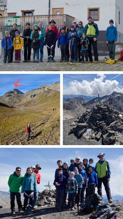 Zu lange halten wir uns nicht auf, denn die ersten Anzeichen der Höhe mit leichtem Kopfweh und Übelkeit kommen bei einigen auf. Doch bevor wir den Abstieg antreten, verewigen wir uns stolz mit einem gemeinsamen Gipfelfoto. Für viele von uns der erste Dreitausender, und vermutlich ist Felix mit seinen sechs Jahren der jüngste Dußlinger, der je einen „Dreier“ selbst bestiegen hat.
