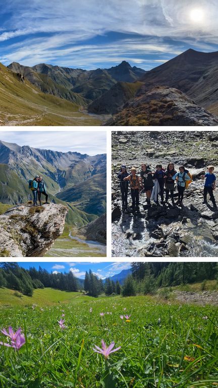 Vor der Alp Griosch öffnet sich nun langsam das Tal und ein Meer von Herbstzeitlosen begrüßt uns in die neue Jahreszeit. Weiter sanft absteigend bewundern wir die Felspyramiden und geniessen dann die Einkehr im Hof Zuort. Von dort lassen wir uns durch das langgezogene Tal mit zwei Bergtaxis zu unserer Herberge nach Sur-En chauffieren.