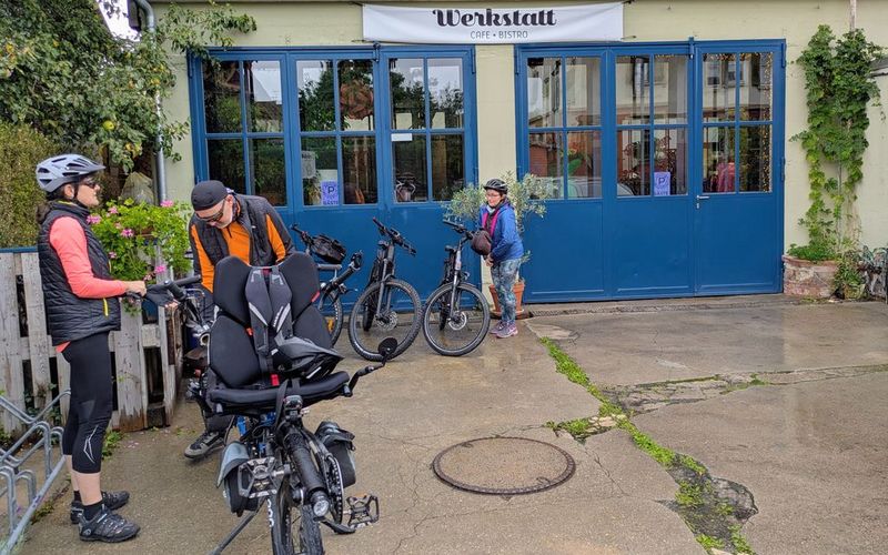 Am Ortsende von Oberndorf kam dann der gefürchtete Regen, doch wir hatten Glück und konnten beim Gasthaus Sonne unterstehen. Danach ging es trocken zu unserem Einkehrziel „Werkstatt“ (Café & Bistro) in Seebronn, wo wir gerne länger geblieben sind, da es sehr gemütlich und lecker war.