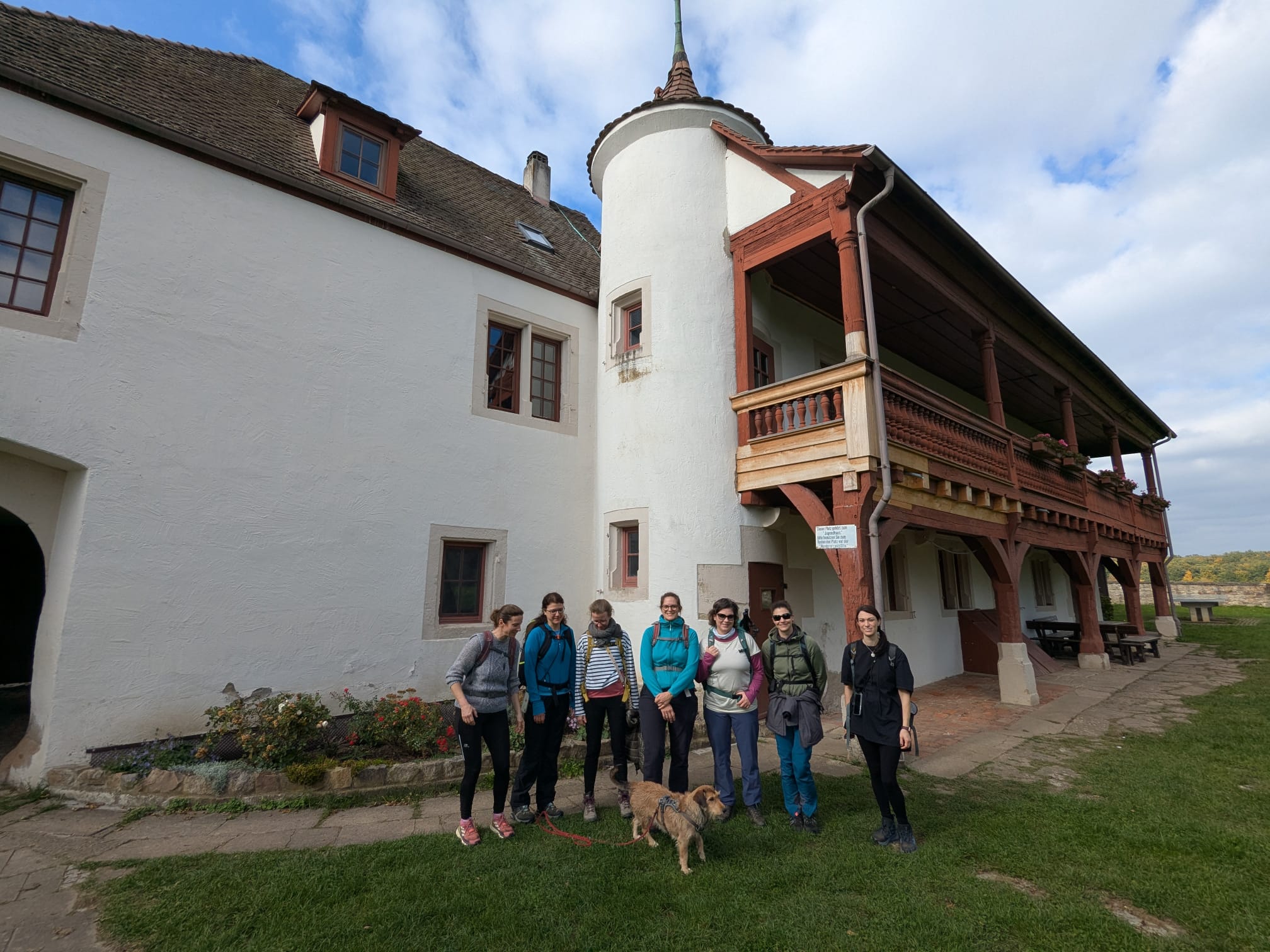 Der Sonntag des 12. Oktober hätte schöner kaum sein können: strahlend blauer Himmel, angenehm frische Luft und die Wälder rund um Kirchentellinsfurt in ihren leuchtendsten Herbstfarben. Sieben wanderfreudige Frauen und ein Hund machten sich an diesem Tag auf den Weg, um den Geschichtspfad rund um das Schloss Einsiedel zu erkunden.