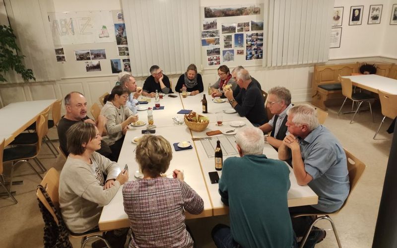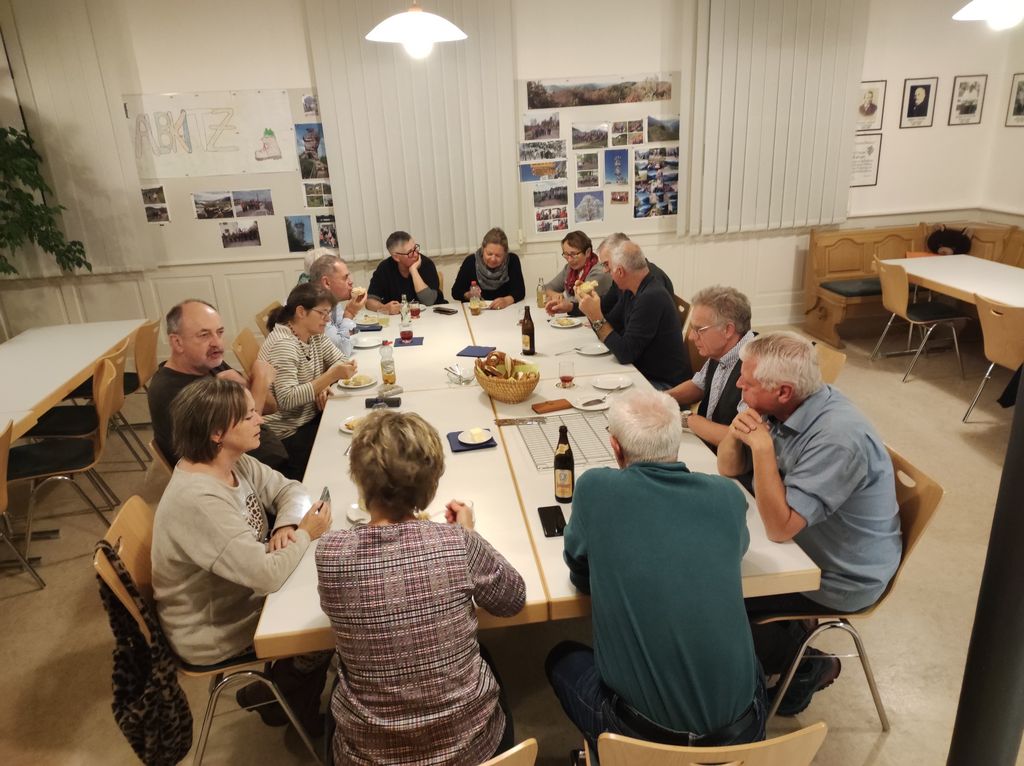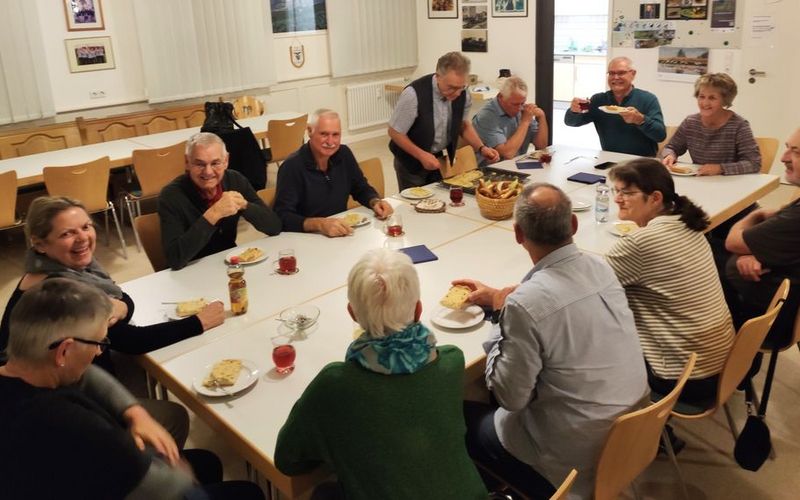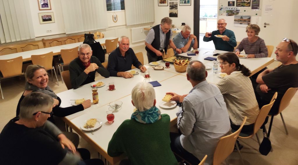 Am vergangenen Freitag, 17.10.2025, fanden sich bei Zwiebelkuchen und, passend dazu, Apfel-Kirsch-Most, insgesamt 15 Liebhaber des vorgenannten Gebäcks und Freunde der gepflegten Unterhaltung in der Albvereins-Lichtstube ein. Die meisten griffen beherzt zu und diejenigen, die das Lauchgewächs nicht mögen oder vertragen, konnten sich alternativ mit etwas „Laugigem“ versorgen. Zur Freude der Bäckerin und des Veranstalters des Lichtstubenabends wurden beide Bleche (32 Kuchenstücke) restlos verputzt und nebenbei viel erzählt, diskutiert und herzhaft gelacht. Ein herzliches Dankeschön allen, die wieder dabei waren und der Einladung zu dem einmal monatlich stattfindenden Treffen gefolgt sind!