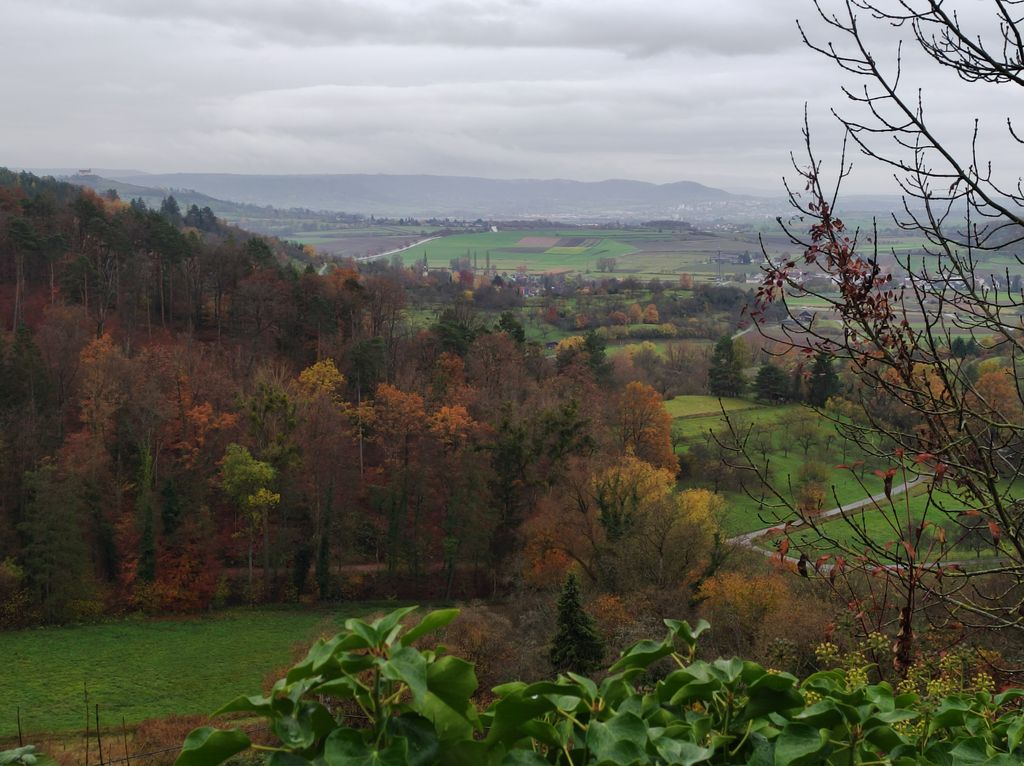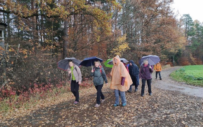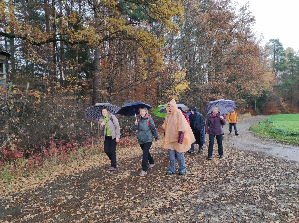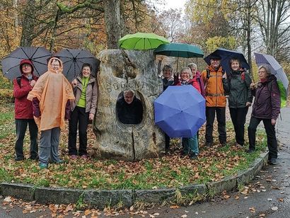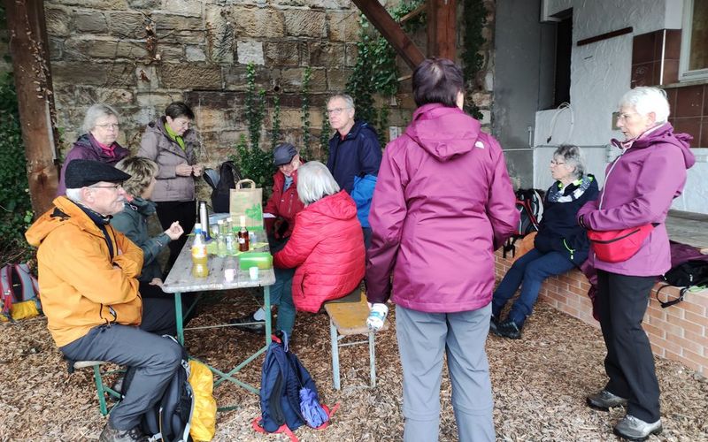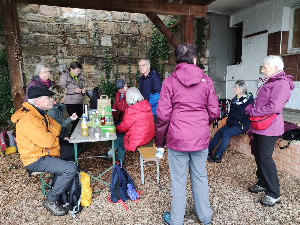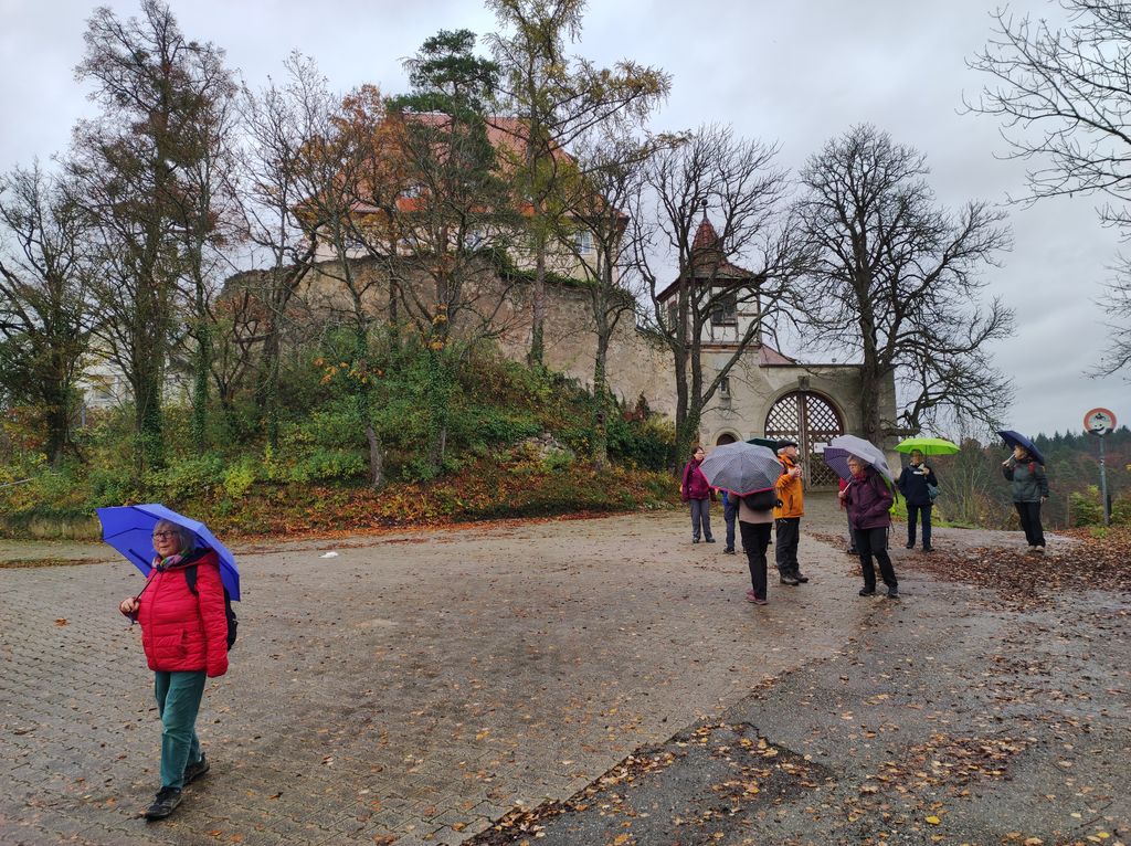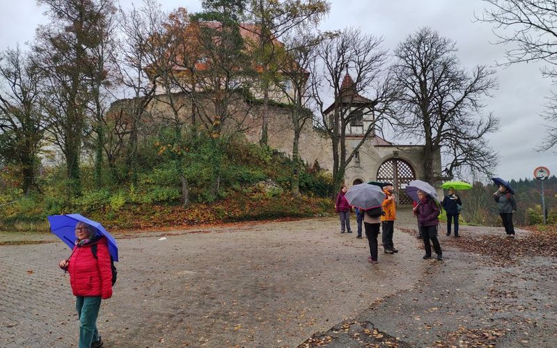 Bei bedecktem Himmel trafen sich 11 Wanderer am Heuberger Tor und brachen gut gelaunt zum Schloss Roseck auf. Leider kannte Petrus kein Erbarmen und begleitete die gesamte Tour mit Regen, was wir da aber noch nicht wussten. In Roseck waren wir froh, dass die Aussicht Richtung Wurmlinger Kapelle passabel war, und dass es dort eine Überdachung mit Bierbänken gab, unter der wir im Trockenen Pause machen konnten.