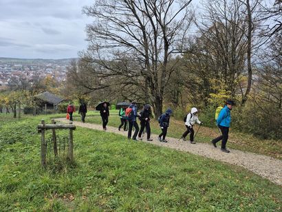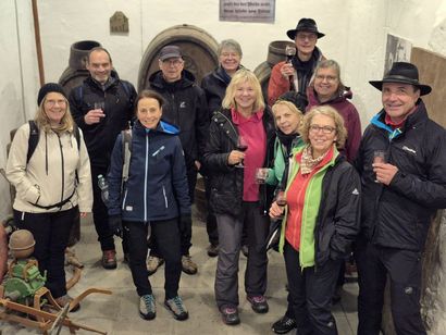Wir starteten mit Weinglas und Rucksackvesper im Gepäck – bei noch trockenem Wetter – hoch und noch höher in die Weinberge. Mit herrlichem Blick von oben auf Metzingen wurde uns beim ersten Halt zu Beginn ein sehr feiner Sekt serviert. Weiter ging es in Begleitung von leichtem Nieselregen bis zum Stopp an einem Bänkle, wo der Silvaner der „blauen Wand“ – ein Verkaufsschlager – auf uns wartete. Wir lernten viel über die heimisch angebauten Trauben und wie daraus leckerer Wein entsteht. Auf unserer weiteren Wanderung wurde es leider auch von oben immer nasser. Wir verkosteten noch einen Roséwein am eigenen Weinberg mit Weinberghäusle der Freunde und beschlossen hier bei Rucksackvesper, die Tour etwas abzukürzen. In unserer letzten Pause widmeten wir uns einem Rotwein, einem Cuvée, den wir in einem ehemaligen Wasserspeicher, dem „grünen Häusle“, probieren durften und durchweg für sehr gut befanden. Von dort ging es dann schnurstracks ins Weinbaumuseum in die Stadt, wo wir noch zum Abschluss eine interessante Führung bekamen und unser Ausklang stattfand.