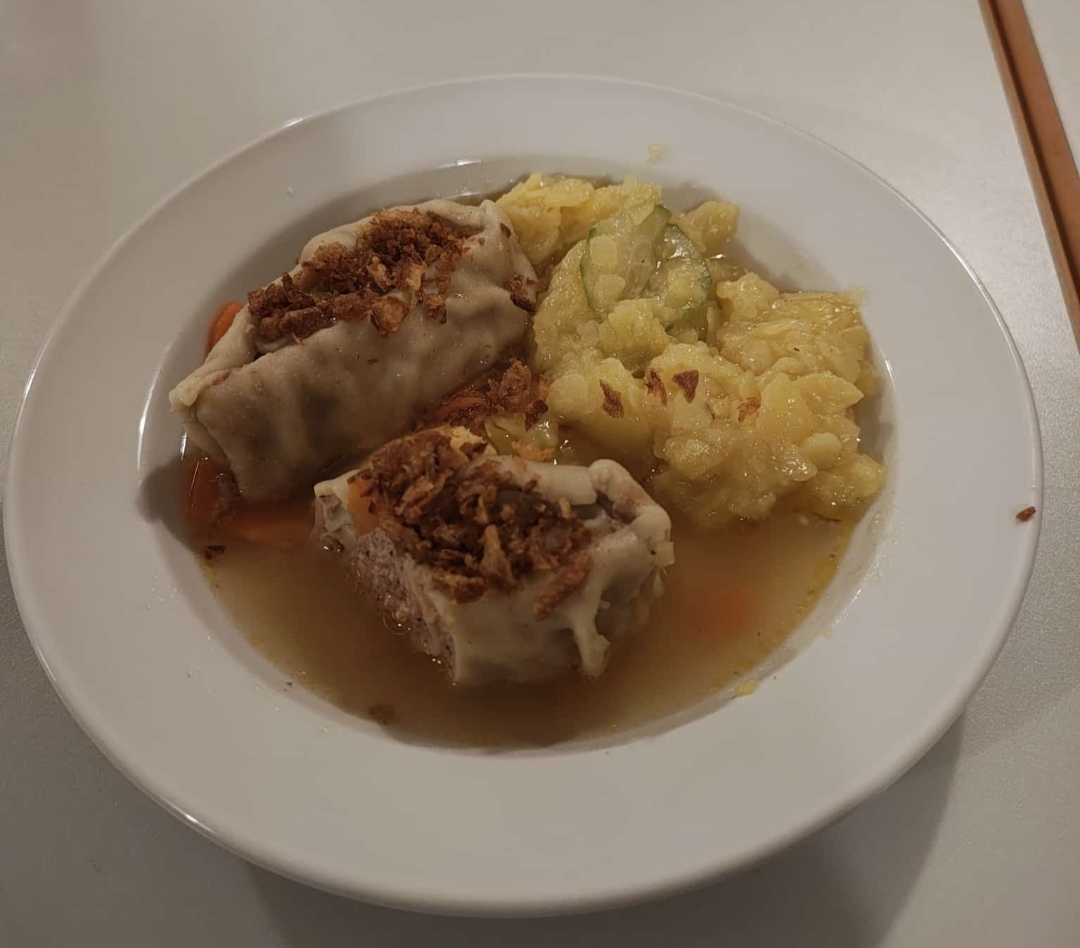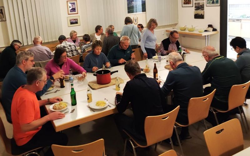 Nach der Rückfahrt traf man sich in der Albvereins-Lichtstube, da wir zum Abschluss noch mit einem „perfekten Dinner“ verwöhnt wurden. Leckere Maultaschen von einem Metzger aus der näheren Umgebung wurden in selbstgemachter Fleischbrühe von Margit Burkhardt und Uli Frey erwärmt. Zwei große Schüsseln und eine kleinere Schale, ebenfalls frisch angemachter und noch lauwarmer Kartoffelsalat von Reiner Futter, kamen on top dazu. Schwabenherz, was willst Du mehr?!