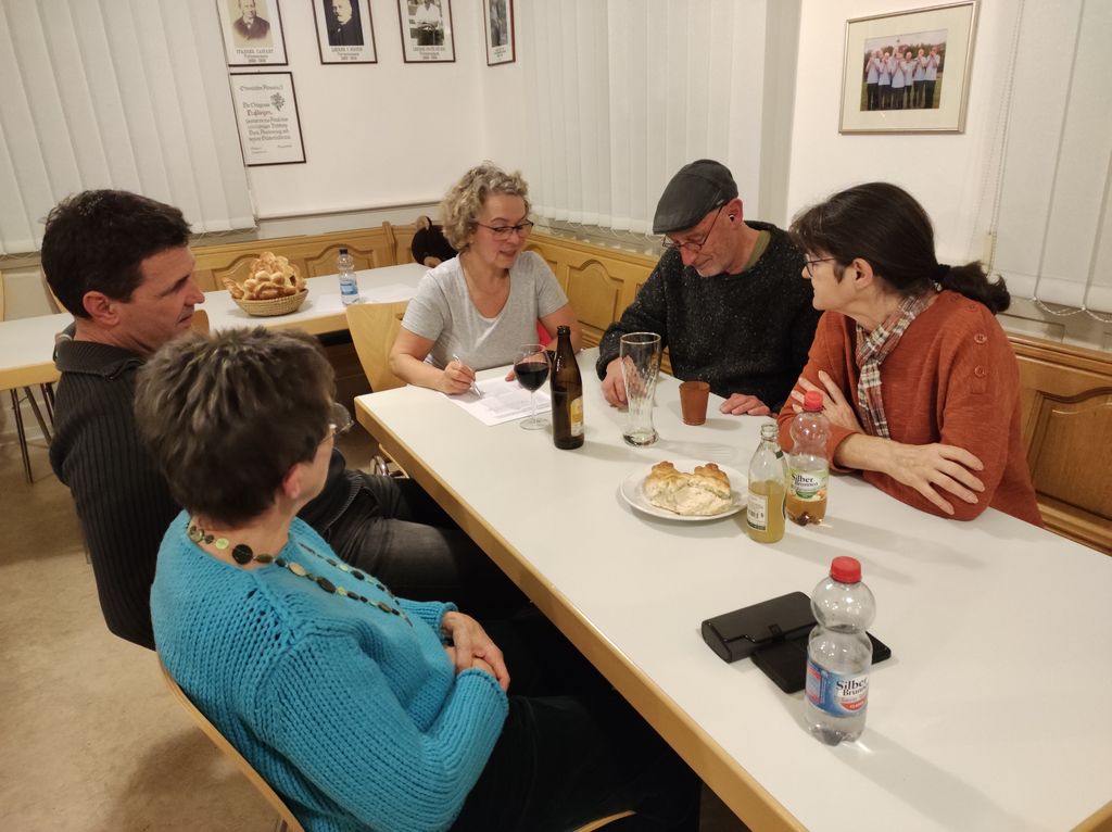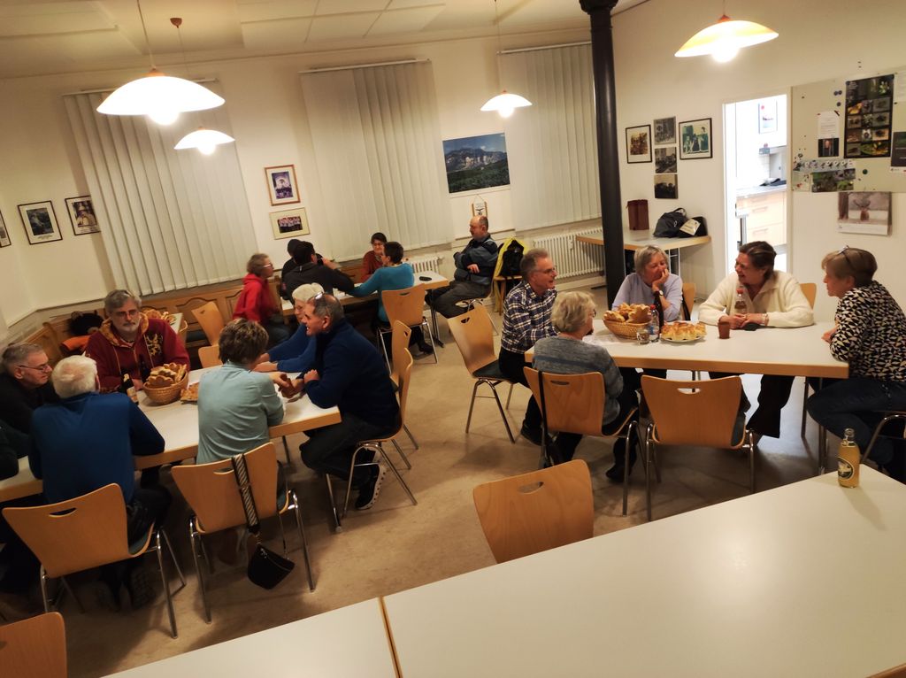 An drei Tischen mit je sechs bzw. einmal sieben Personen wurde eifrig gespielt und um das begehrte Gebäck gewürfelt. Während die großen Sterne zum Essen für alle auf dem Tisch standen, mussten die kleinen Teile mittels kleiner oder großer Hausnummer, Mäxle, Sequenz und anderen für diesen Abend typischen Würfelspielen erkämpft werden. Unter viel Gelächter und entsprechenden Kommentaren wechselte eine Mutschel um die andere in den Besitz der glücklichen Gewinner/-innen. Nachdem sich am Ende bei den einen bis zu vier Teile des Zackengebäcks stapelten, hatte manch Andere/-r nicht so viel Erfolg gehabt. Aber es musste auch niemand leer nach Hause gehen, da, wie so üblich, die reich Beschenkten den Pechvögeln etwas abgaben. Gegen 23.30 Uhr verließen die letzten Albvereinler die Lichtstube und Rolf bedankte sich herzlich bei den Teilnehmenden fürs Kommen und für den unbeschwerten, harmonischen und lustigen Abend.