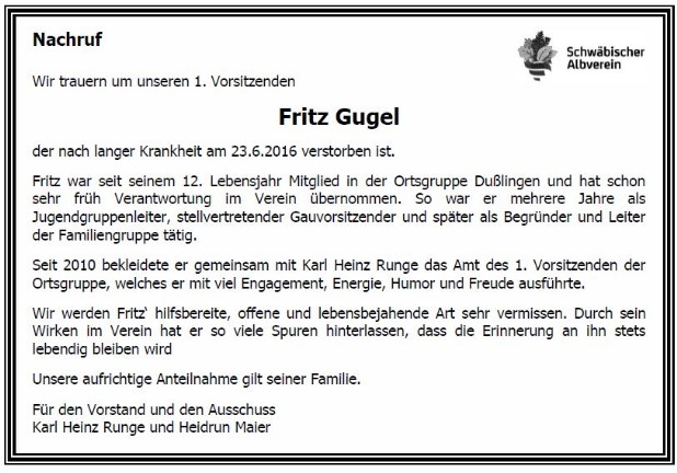 Wir gedenken unseres 1. Vorsitzenden Fritz Gugel, der am 23.6.2016 nach langer Krankheit verstorben ist.